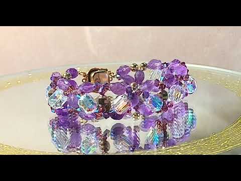 This is a real showstopper of a bracelet. So full of beautiful rich color and sparkle. It is a handmade woven cuff bracelet of genuine amethyst , Austrian crystal and gold filled beads. This is a one of a kind bracelet, in a unique style, that will elevate any fashion look