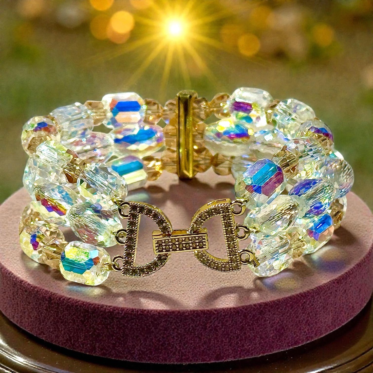This is a sparkling beautiful handmade crystal cuff bracelet, perfect for a evening look. This is a neutral tone, that will go with almost any evening look. A crystal gold clasp in the back, so the bracelet can be worn front or back.