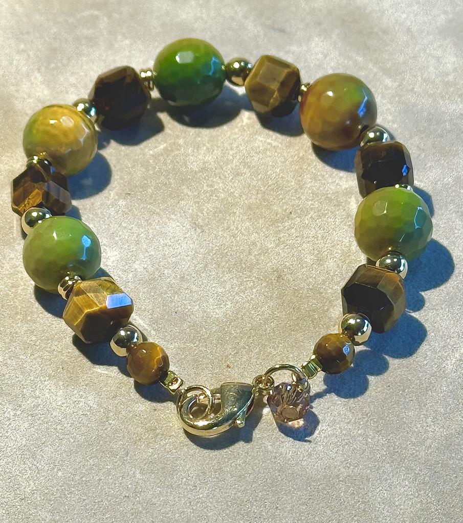 This is a rich gemstone bracelet with beautiful shades of golds, greens and brown. It good to wear on its own or to layer with other bracelets.