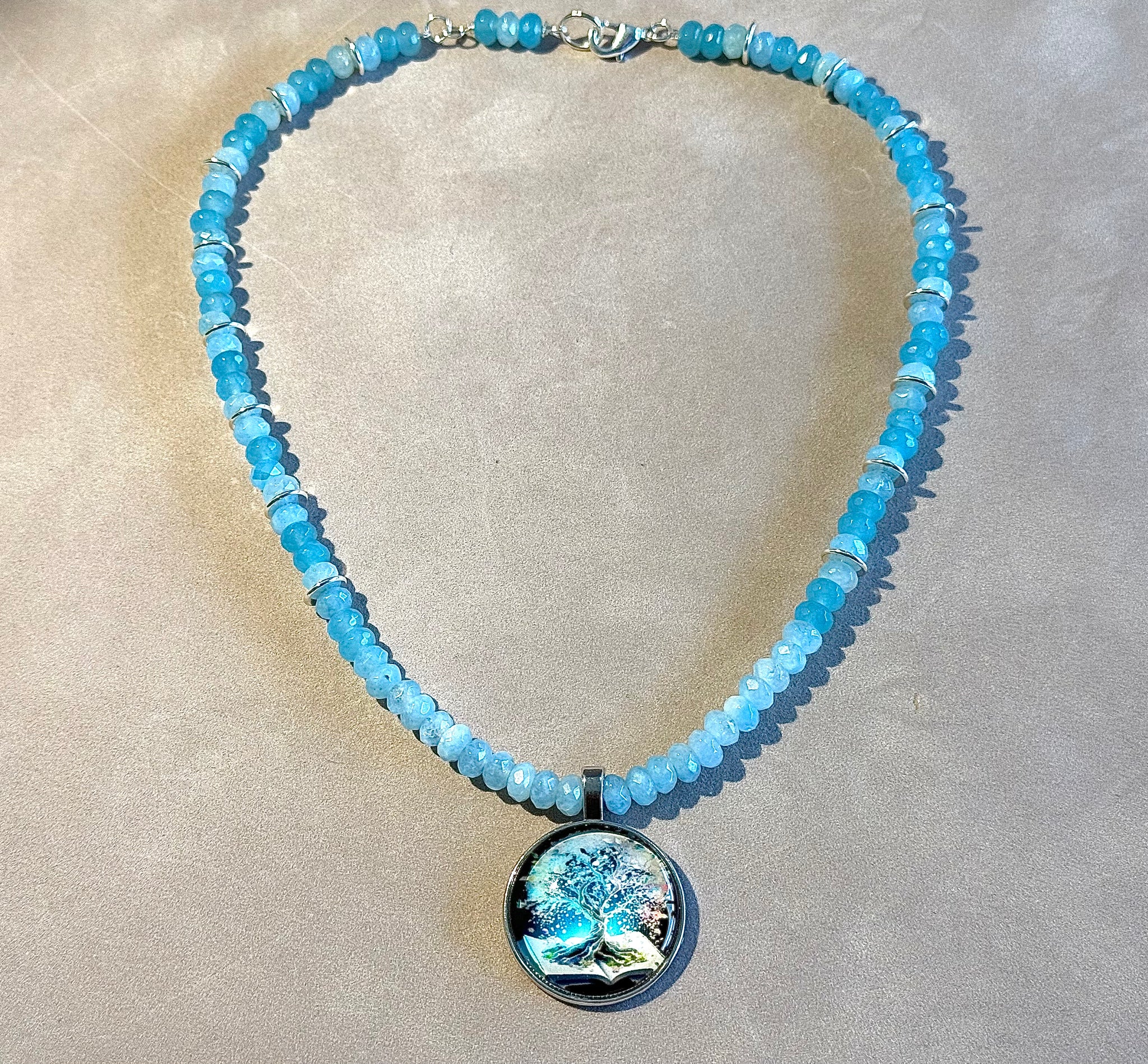 This is a chic blue quartz gemstone necklace, the pendant has the tree of life design inside. Its a unique piece of jewelry, timeless modern necklace