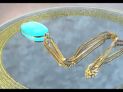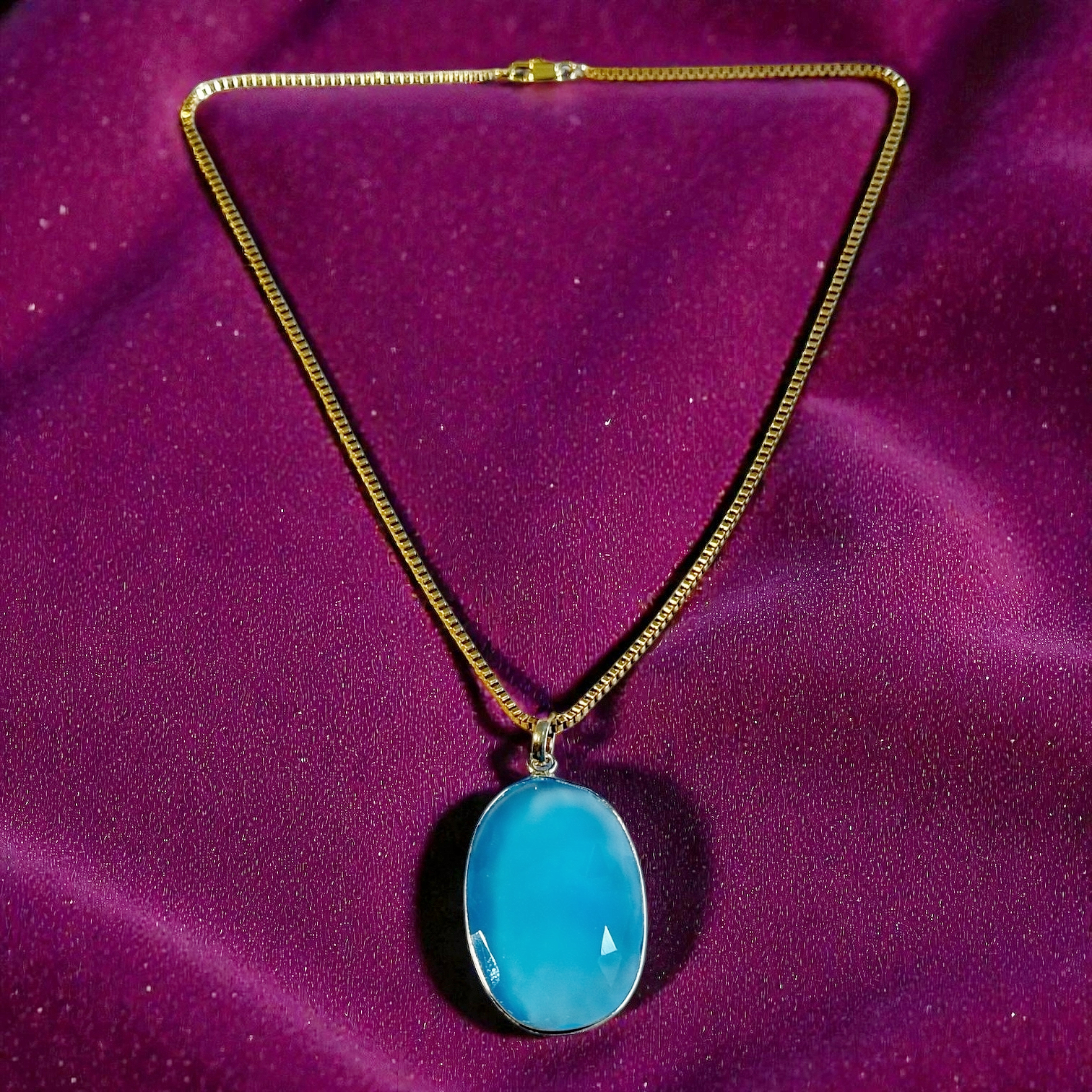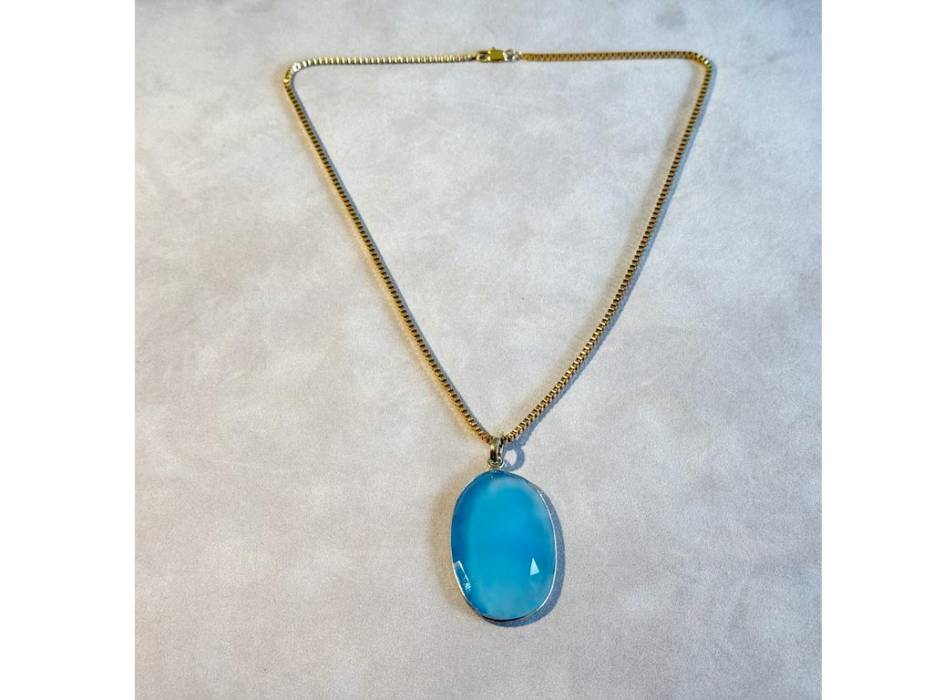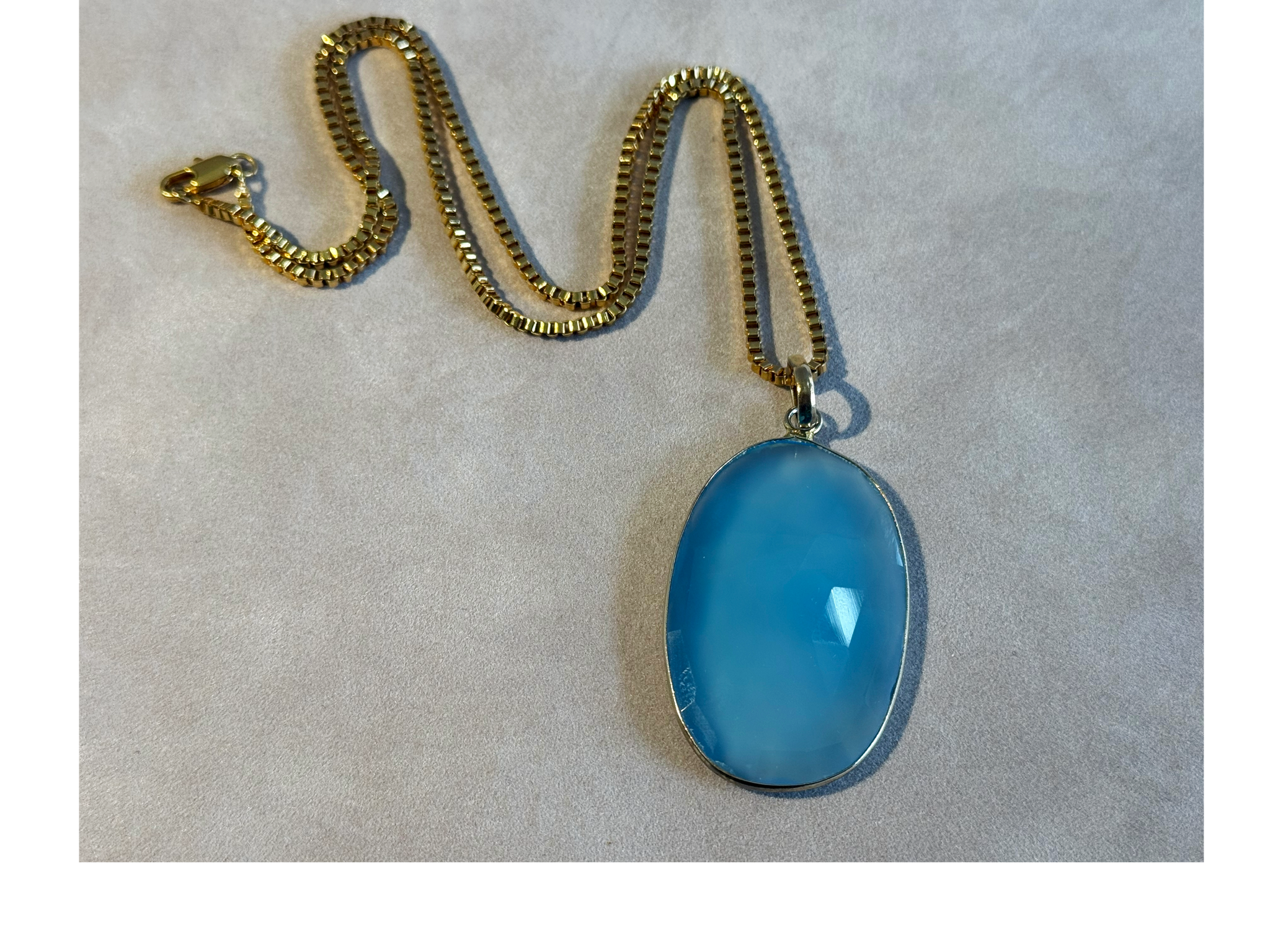 Gemstone: Oval facet cut 25Mm blue Chalcedony gemstone set in gold on a 14 k gold filled chain.