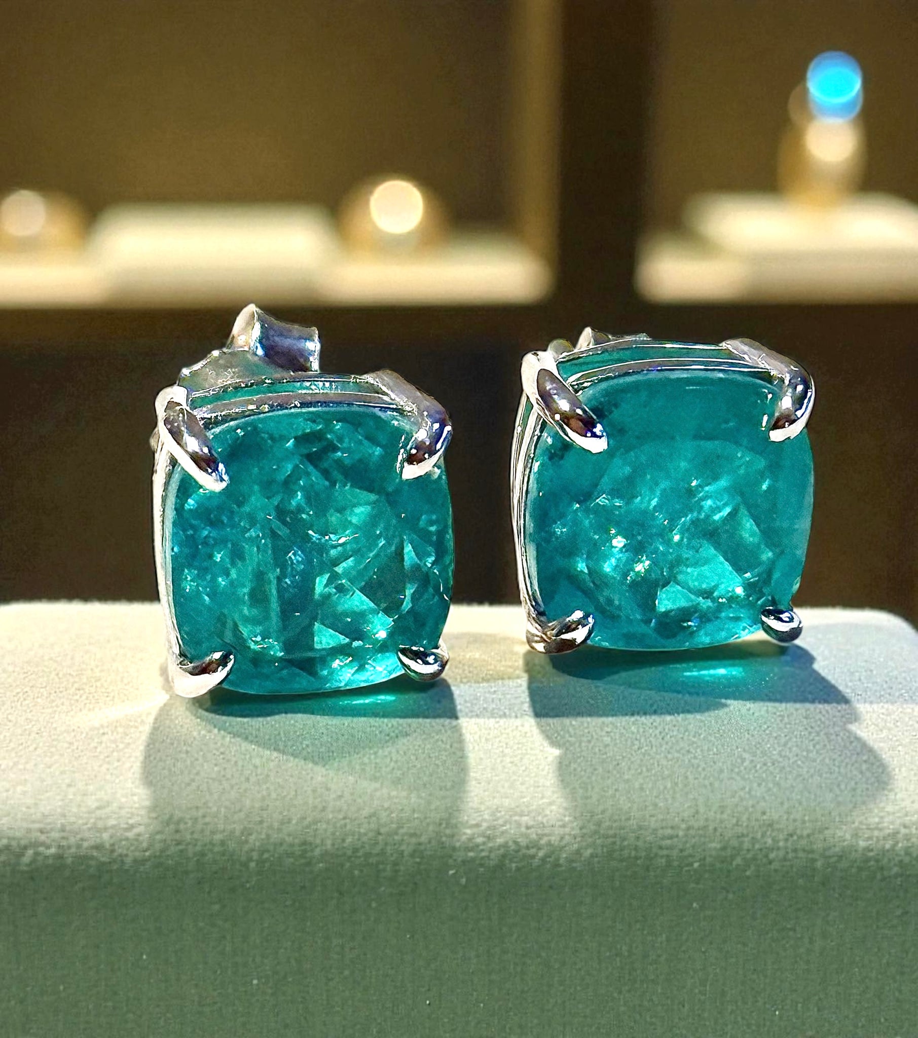 These are stunning bold stud earrings in beautiful emerald green Paraiba tourmaline gemstones. The Paraiba tourmaline gemstone comes in from Brazil. It is one of the most popular colors for this season. These earrings sit comfortable on the ear and can be worn anytime day or evening. They are a timeless classic style. The Paraiba Tourmaline gemstone is highly sought after and it value comes because of its vibrant natural colors in the gemstone.