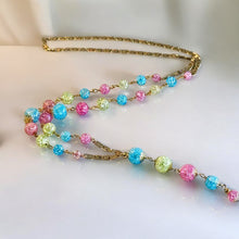 This is an handmade long necklace of soft Easter egg colors of pink ,blue and yellow crystal quartz gemstone which are blended with a 18 k gold filled gold link chain.