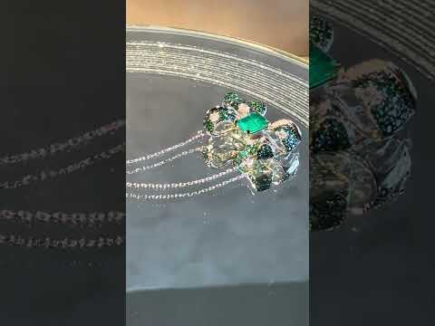 Gemstones: Center square cut green Paraiba tourmaline 1.5 CWT. mixed in the flower designer is .5 CWT of tiny blue and green tourmaline gemstones.
