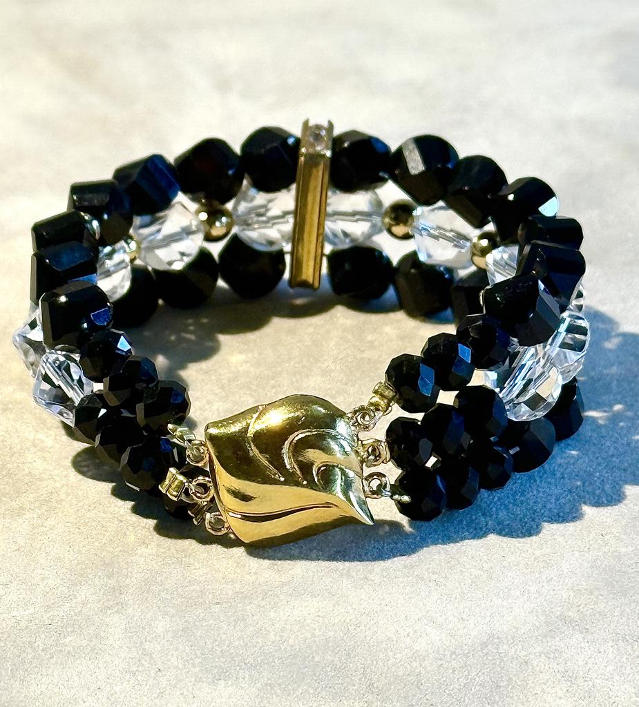 This woven handmade cuff beaded bracelet is bold and beautiful, for the woman who love a black and white look. Wear it day or evening. The classic cuff style bracelet will elevate you fashion. This size is best suited for a women with a smaller wrist. It has a gold detail clasp that can be worn front or back of the bracelet