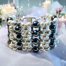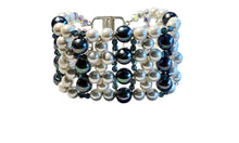 Gemstones: blue and white round 10 mm and 8 mm mother of pearl woven with blue and white Austrian crystals. Has a sterling silver clasp
